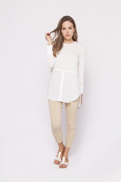 MÁS INFORMACION Realizado en Lanilla morley con postizo de voile en ruedo y puños aportando elegancia y personalidad a la prenda. Formato clásico. Manga larga pegada. Cuello redondo. Gota en escote espalda. Largo prenda debajo de la cadera, ruedo irregular, más largo atrás. Si querés estar cómoda y no perder la elegancia, esta prenda es para vos! Fresca y con mucho estilo, podes encontrarlo en una vibrante y variada paleta de colores.
