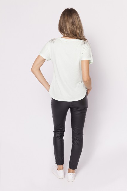 MÁS INFORMACION Realizado en Jersey . Formato clásico. Largo a la cadera. Ruedo levemente curvo. Manga corta, sin sisa. Escote en V. Detalle de aplique metálico en hombro. Podes encontrarla en una hermosa paleta de colores pasteles. Súper canchera, sumala a tus looks!