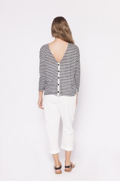 MÁS INFORMACION Realizado en Lanilla rayada. Formato over size, caja cuadrada con hombro caído y manga larga pegada. Ruedo recto irregular, más largo atrás, con tajitos en laterales. Posee cuello redondo en delantero y en V profundo en espalda. Detalle de cinta con botones en espalda. Gracias al escote y detalle en espalda, el sweater Josalene le dará un estilo más chic y con personalidad a tus looks.