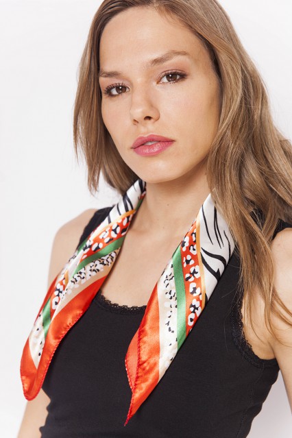 MÁS INFORMACION Realizado en Seda estampada con motivo mix animal print y guardas de colores que le aporta textura. Formato cuadrado, medida 48cm x 48cm. Un accesorio versátil que no te puede faltar!