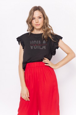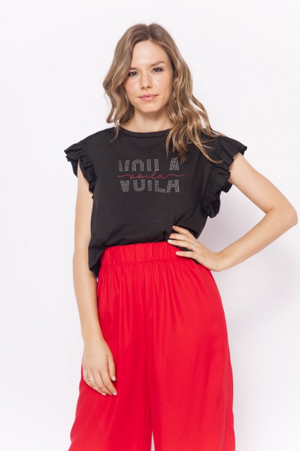 MÁS INFORMACION Realizado en Jersey . Formato clásico, levemente over, largo por debajo de la cintura. Escote redondo. Con detalle de voladito en sisa que le da un toque naif. Estamapa central con detalles de tachitas facetadas, que le aporta brillo y la hace una prenda única!