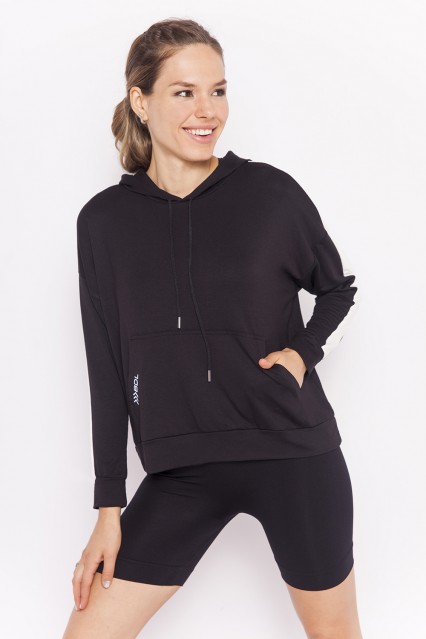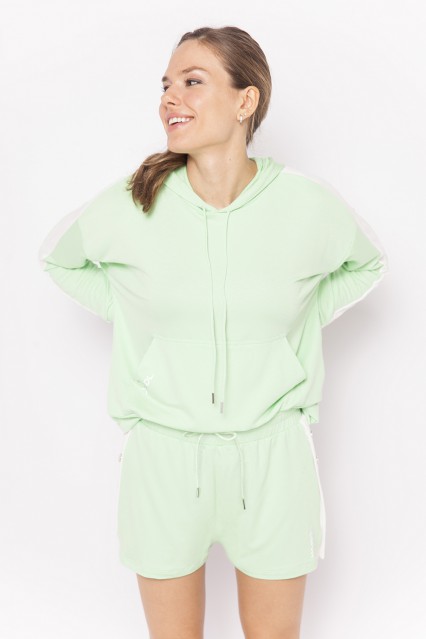 MÁS INFORMACION Realizado en Rustico liviano en una hermosa y delicada paleta de color. Manga larga, con capucha. Detalle de tira lateral contra tono. Cordón al tono con terminal metálica y reflectivo marcario en bolsillo. Largo a la la cadera. Una prenda con mucha onda para hacer tus actividades físicas con estilo y comodidad. Podes optar por el total look o conjunto completo si elegís también la babucha Alfreda.