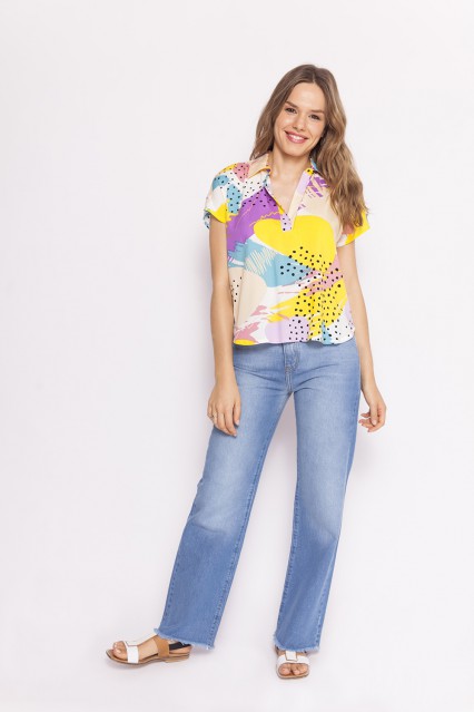 MÁS INFORMACION Realizado en Voile estampado con motivo de manchas en una saturada y atractiva paleta de color. Manga corta, escote tipo chomba con cuallo de camisa. Caja cuadrada que se adaptará a diversas siluetas, largo a la cadera. Una prenda que captará todas las miradas con un aire fresco y juvenil.