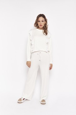 MÁS INFORMACION Realizado en Rustico viscosa tela de hermosa caída y gran comodidad en el uso. Manga larga con puños en mangas y cintura en igual tela. Escote redondo. Detalle de voladitos verticales de broderie al tono que le dan un aire romántico y súper femenino a la prenda, aportándole personalidad y calidad a esta hermosa prenda. Podes usarlo en conjunto con el pantalón PERTH, será un total look divino. El outfit mas cómodo y ondero que tendrás!