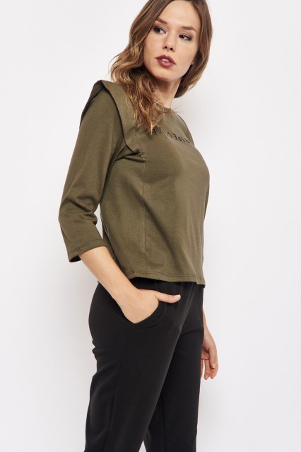 MÁS INFORMACION Realizado en Jersey liso. Escote redondo, manga tres cuartos. Detalle de sobre manga que le da una hermosa estructura a la prenda que estilizará la figura. Largo a la cadera. Caja clásica. Estampa tipográfica monocromática en delantero.
