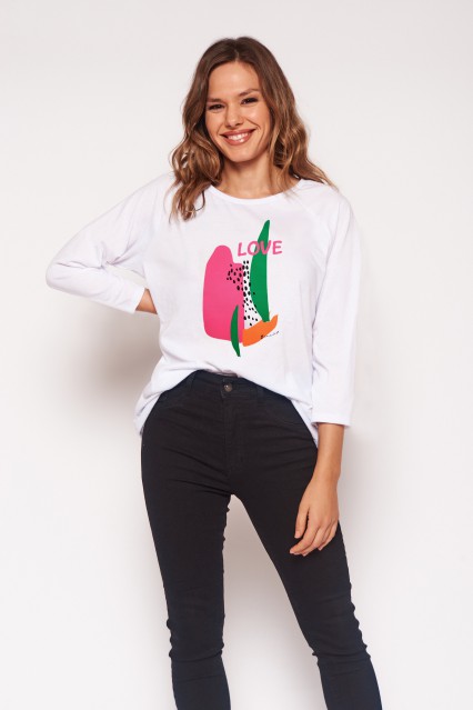 MÁS INFORMACION Realizado en Jersey liso en una hermosa paleta de color. Manga ranglan tres cuartos, escote redondo. Estampa de diseño abstracto con mucho estilo y un gran colorido. Largo a la cadera. Calce clásico, que se adaptará con suavidad a las líneas de cuerpo, no te pierdas esta propuesta distinta!