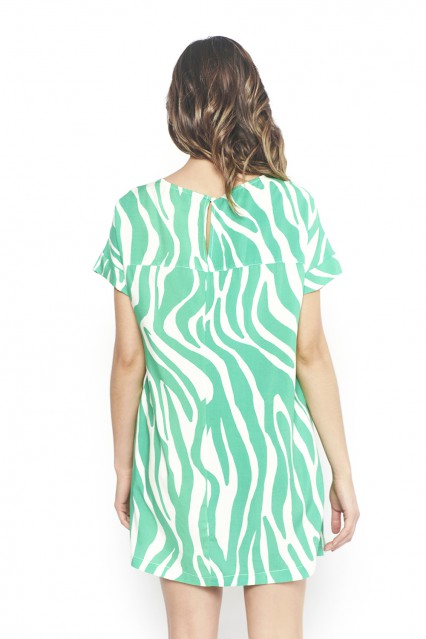 MÁS INFORMACION Realizado en Voile estampado animal print bitono en una saturada paleta de color. Manga corta con zócalo en igual tela, escote redondo. Canesú en delantero y espalda con cartera. Largo sobre la rodilla. Caja cuadrada, calce over suave que se adaptará con holgura a la silueta.
