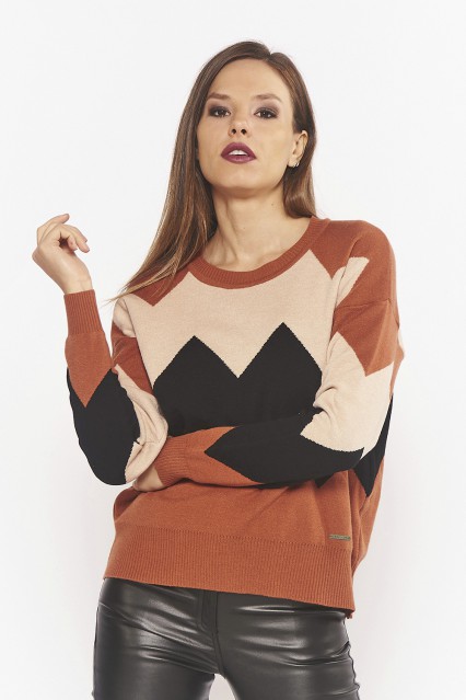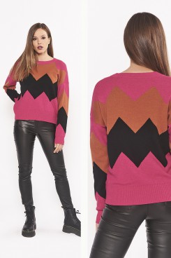 MÁS INFORMACION Realizado en Lana con acrilico a tres colores, en una hermosa paleta combinada de color. Escote redondo, manga larga, calce clásico. Caja cuadrada sutil, largo a la cadera. Dibujo zig zag que le aporta personalidad a la prenda. No te lo pierdas!