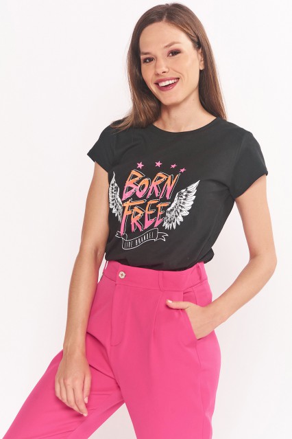 MÁS INFORMACION Realizado en Jersey liso en una hermosa paleta de color de alta tendencia en esta temporada. Manga corta, escote redondo, calce clásico, largo a la cadera. Estampa central tipográfica y alas en una hermosa paleta de color degradé.