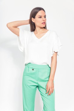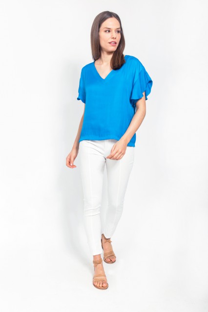 MÁS INFORMACION Realizado en Seda lisa, tela de hermosa mano y un brillo sutil que le da un aire súper elegante y femenino. Manga corta estilo volado con hermosa caída. Escote V en delantero y espalda. Lazo de igual tela en espalda. Largo a la cadera. Calce clásico. Hermoso colorido, no te la pierdas!