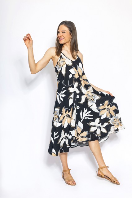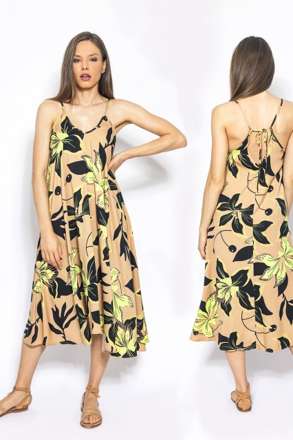 MÁS INFORMACION Realizado en Lino estampado con motivo vegetal floral en una hermosa paleta de color. Breteles finitos en igual tela con cruce y escote profundo en espalda. Escote V que estilizará la figura. Formato evasé súper amplio que se adaptará a diversas siluetas. Largo debajo de la rodilla, calce clásico.