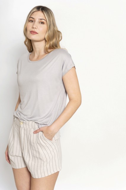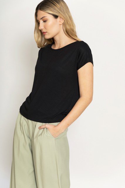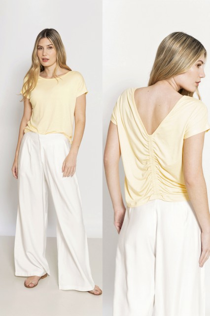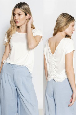 MÁS INFORMACION Realizado en Modal con Lycra liso, manga corta escote redondo. Detalle en espalda de frunce vertical y escote V que le aporta un aire fresco, sexy y delicado a la vez. Largo a la cadera, calce clásico. Caja de estilo cuadrado. Un básico con mucha onda que no te podes perder.
