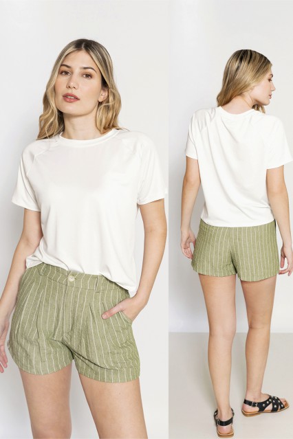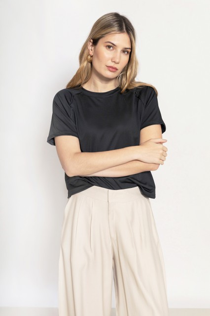 MÁS INFORMACION Realizado en Microfibra lisa, tela de un sutil brillo y hermosa mano. Escote redondo, manga corta ranglan. Calce clásico, largo a la cadera. Un básico súper combinable que no puede faltar en tu armario!