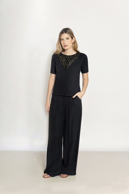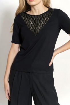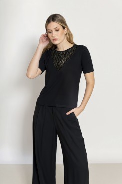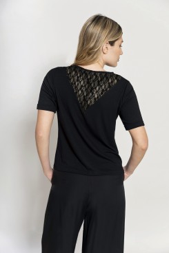 MÁS INFORMACION Realizado en Modal negro combinado con encaje al tono en recorte escote V, dándole un aire sexy y femenino a la prenda. Manga corta con zócalo en igual tela al codo. Escote redondo, largo a la cadera. Calce clásico. Una prenda cómoda y elegante para distintos outfit súper cancheros!