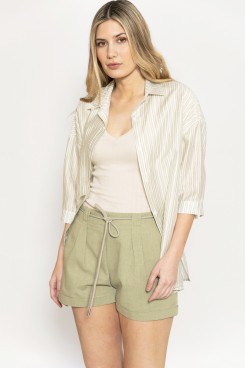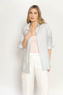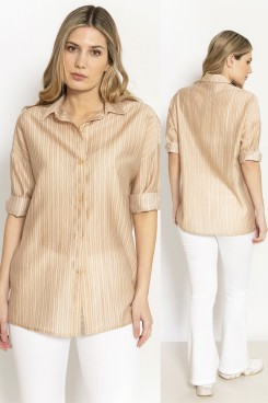 MÁS INFORMACION Realizado en Tencel translucido plizado, tela fresca, con un brillo tornasolado sutil y de hermosa mano, ideal para darle estilo y textura a tu look. Cuello camisa, manga tres cuartos con botones de pasta al tono. Largo debajo de la cadera con tajitos laterales pequeños. Calce clásico.