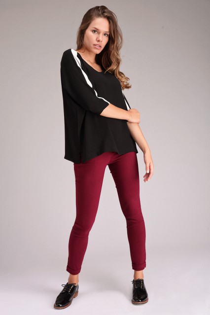 MÁS INFORMACION Realizado en Creppe . De corte cuadrado, escote U, largo a la cadera con tajos laterales, manga ranglan 3/4 con franja contra tono, uno de los detalles que serán tendencia en la temporada.