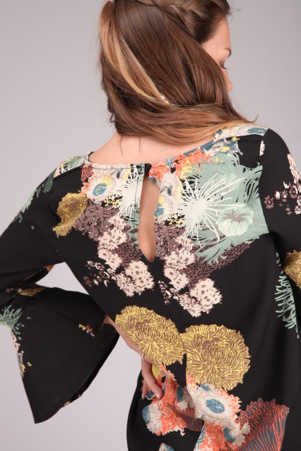 MÁS INFORMACION Realizado en Twill satinado estampado flores. Manga larga acampanada, cuello redondo, Prenda de corte evasé,con gota en espalda y botón de pasta al tono de la base, largo a la cadera.