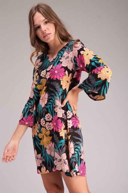 MÁS INFORMACION Realizado en Voile . De corte evasé, escote redondo, con lagrima en espalda y botón de pie metálico, mangas campana 3/4 , largo arriba de rodilla. Su estampado y colorido lo hacen una prenda super femenina ideal para lucirte esta temporada.