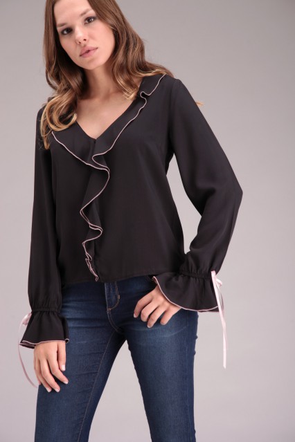 MÁS INFORMACION Realizado en Voile liso. Mangas largas, con elástico suave en puño, volado y cinta decorativa a contra tono. Largo a la cadera, escote V con volado y ruloté a contra tono. Una prenda con un estilo bien femenino para lucir esta temporada.