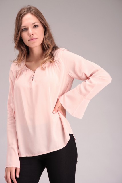 MÁS INFORMACION Realizado en Voile liso. Manga acampanada, con dos botones de pie metálicos en cartera, y sutil frunce en canesú delantero y espalda. De corte evasé que le da una excelente caída, una prenda con muy suave mano disponible en los colores tendencia de la temporada.