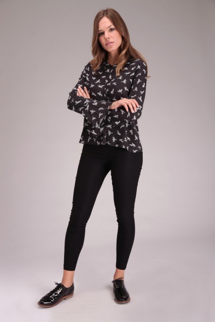 MÁS INFORMACION Realizado en Voile . Manga larga acampanada, escote redondo con lágrima central en delantero, y botón de pie metálico y gota en espalda. Una prenda con hermosa caída, super delicada, con estampado de pajaritos que le da un estilo naif a la prenda.
