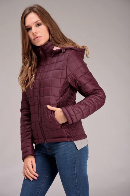 MÁS INFORMACION Realizado en Matelasse de nylon. Cuello alto y capucha, forrería contra tono hermosamente combinada. Largo a la cadera, detalle de entalle en laterales que estilizará la figura.