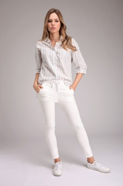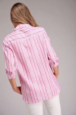 MÁS INFORMACION Realizado en Lino . Manga 3/4 con botón de pasta crudo, largo a la cadera con ruedo curvo y estampado bitono de rayas que le aportan un look cassual a la prenda.