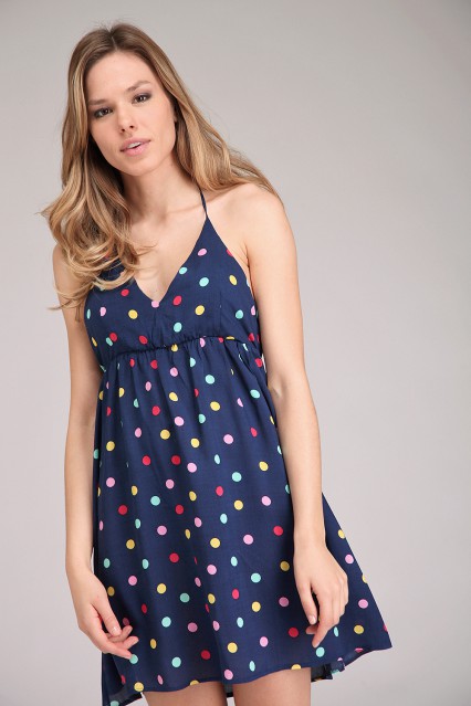 MÁS INFORMACION Realizado en Voile estampado con motivo de lunares multicolores. Breteles finitos, espalda descubierta y ajuste elastizado debajo del busto. Largo sobre la rodilla. Hermosa paleta de color.