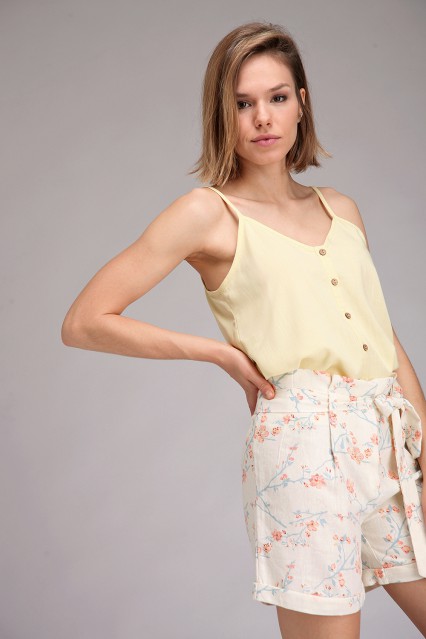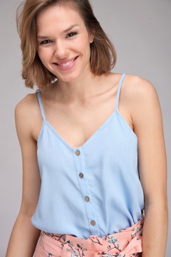 MÁS INFORMACION Realizado en Lino . Escote V con bretel fino y regulador metálico, cartera con botones de coco que generan contraste en la prenda y le aportan el toque de tendencia de la temporada. Su formato evase la da la versatilidad ideal para poder llevarla dentro de una prenda inferior levemente abuchonada o bien suelta a la cadera .