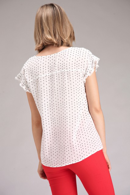 MÁS INFORMACION Realizado en Voile estampado. De corte cuadrado, manga corta con volados que le da un look naif a la prenda, escote V y ruedo suavemente curvo.