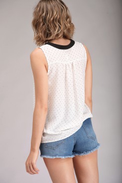 MÁS INFORMACION Realizado en Voile a lunares pequeños bitono combinado con voile liso en lazo de escote. Prenda sin mangas super femenina, largo a la cadera, escote V. Clásica carta de color que le aportará elegancia a tus looks.