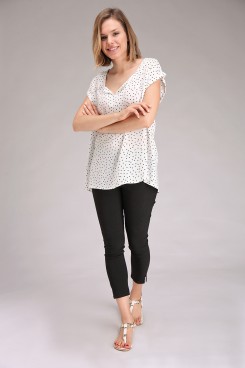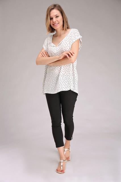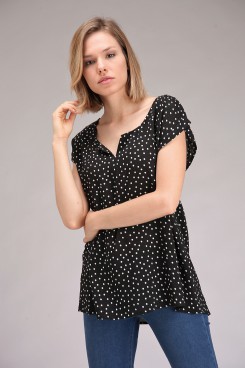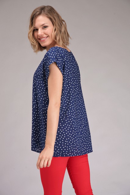MÁS INFORMACION Realizado en Voile estampado de lunares pequeños. Corte cuadrado, mangas cortas con zócalo, escote redondo con abertura V en delantero, largo a la cadera, ruedo curvo. Fresca, sutil y de excelente calce, esta prenda es ideal para generar infinidad de looks.
