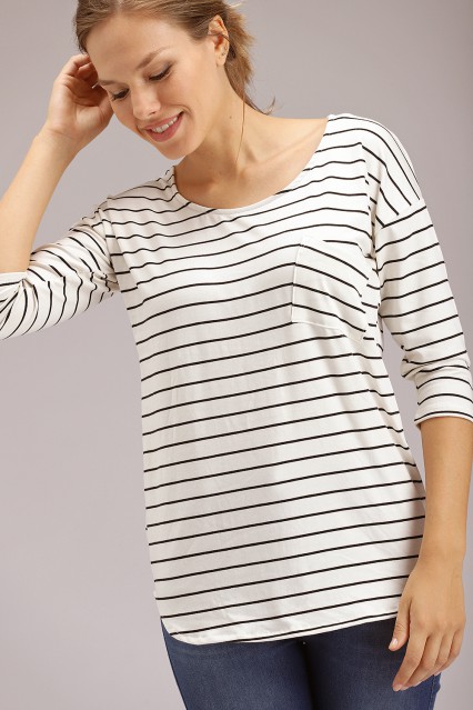 MÁS INFORMACION Realizado en Modal con Lycra rayado. De corte cuadrado, manga 3/4 escote redondo, con detalle de bolsillo plaqué aplicado diagonalmente en costado delantero.