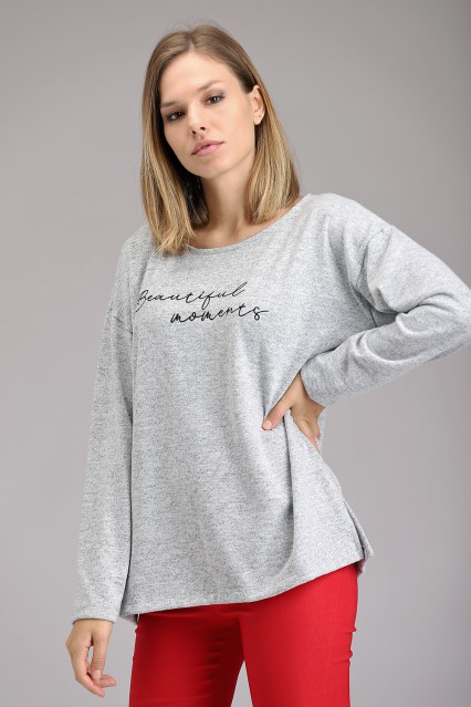 MÁS INFORMACION Realizado en Lanilla melange. Escote redondo, corte cuadrado, ruedo rectos y tajo laterales. Bordado tipográfico que le da un look super femenino a la prenda. De suave mano, muy confortable.