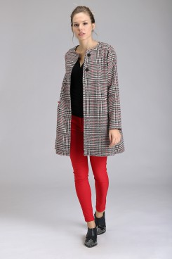 MÁS INFORMACION Realizado en Paño fantasía . Corte evase. Cuello a la base. Acceso delantero con 2 botones metálicos de pie negros. Bolsillos laterales. Sin forrería para generar un look mas soft dada la materialidad de la prenda.