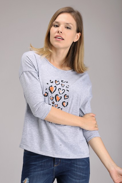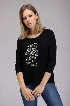 MÁS INFORMACION Realizado en Modal con Lycra liso. Manga tres cuartos, escote bote suave. Caja cuadrada que se adaptará a diversas siluetas. Estampa central en delantero con corazones estilo animal print y tipografía. Largo a la cadera. Hermosa paleta de color.