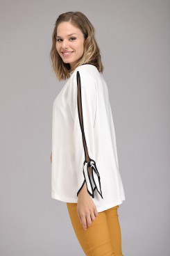 MÁS INFORMACION Realizado en Twill liso. Detalle de vivos contra tono que le aportan personalidad a la prenda. Escote redondo, manga larga con aberturas y lazo envivado que le dan un look súper femenino. Largo a la cadera. Tipología de prenda evasé que se adaptará a diversas siluetas. Hermosa paleta de color.