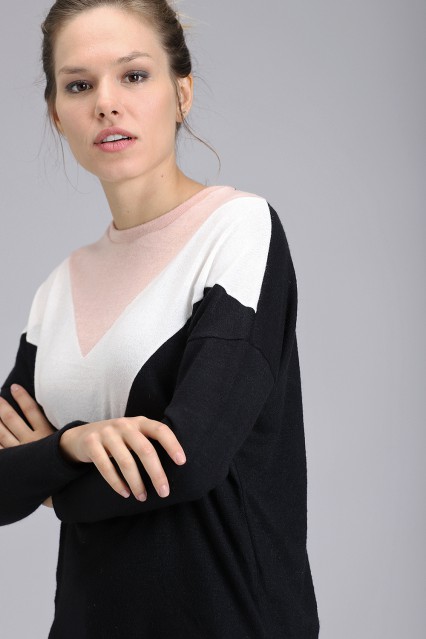 MÁS INFORMACION Realizado en Lanilla lisa de hermosa mano. Combinación a tres colores, recortes en V que estilizarán la figura. Manga larga, escote redondo, largo a la cadera. Una prenda con estilo que se adaptará a diversos outfit.