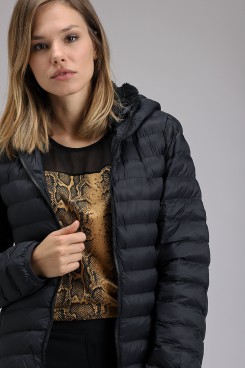 MÁS INFORMACION Realizado en Nylon . Con corderito en su interior. Matelasé horizontal y vertical en los laterales. Capucha. Cierre plástico al tono. Bolsillos laterales con cierre invisible. Largo a la cadera.