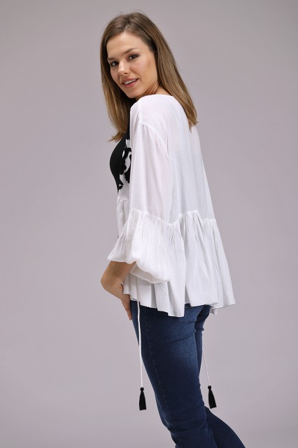 MÁS INFORMACION Realizado en Algodon poliester liso . Largo a la cadera. Con corte en cintura y faldón con frunce. Bordado floral en delantero a contra tono. Tira en igual tela con borlas de hilo de algodón al tono del bordado. Mangas estilo baloon. Prenda liviana y delicada ideal para completar tus outfits esta temporada.