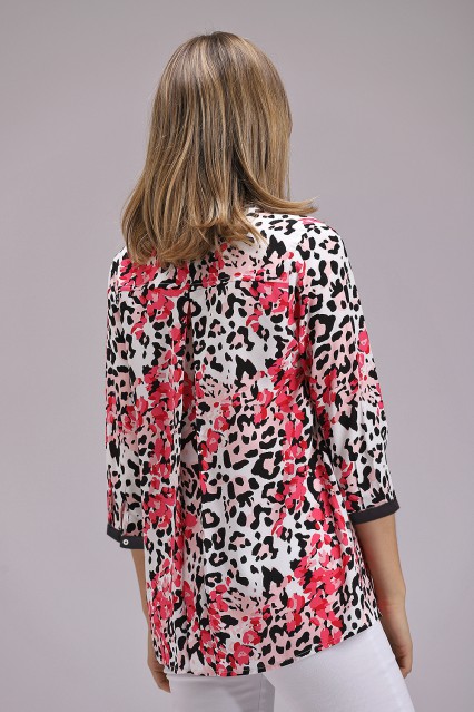 MÁS INFORMACION Realizado en Voile estampado diseño animal print. Manga 3/4 con puño liso y botón de pasta crudo. Espalda con tabla. Ruedo curvo, más largo en espalda.