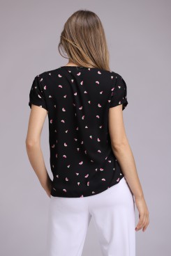 MÁS INFORMACION Realizado en Voile estampado con motivo sandías en una hermosa y delicada paleta de color. Manga corta con zócalo y abertura en hombros. Escote redondo con tabla vertical que estilizará la figura. Corte evasé suave, largo a la cadera.