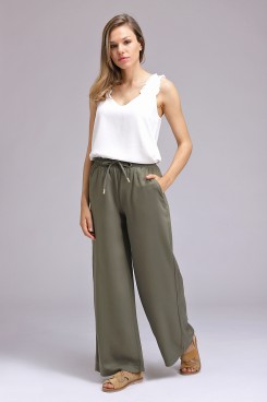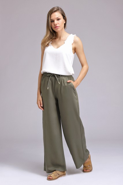 MÁS INFORMACION Realizado en Twill . Estilo palazzo. Tiro alto. Cintura con elástico embutido pisado. Cinta de ajuste de igual tela con terminal metálico. Bolsillos laterales. Tela con excelente caída, liviana y elegante. Esta prenda se puede combinar dado su colorido y materialidad con las blusas Celine, Julieta y Luli, logrando un total look, tip de alta tendencia en esta temporada, dando la visual de una mono prenda.