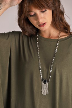 MÁS INFORMACION Realizado en Metal . Cadena larga de eslabones amplios. Con dije triangular chapón con engarce de piedra y flecos de cadenas finas en terminación.