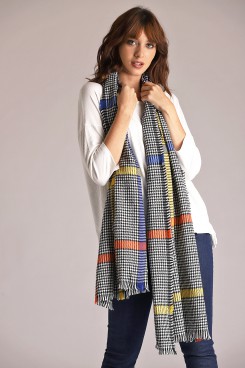 MÁS INFORMACION Realizado en Lana con acrilico . Formato rectangular. Desflecada en los cuatro laterales. Diseño pied de poule con detalles de colores.