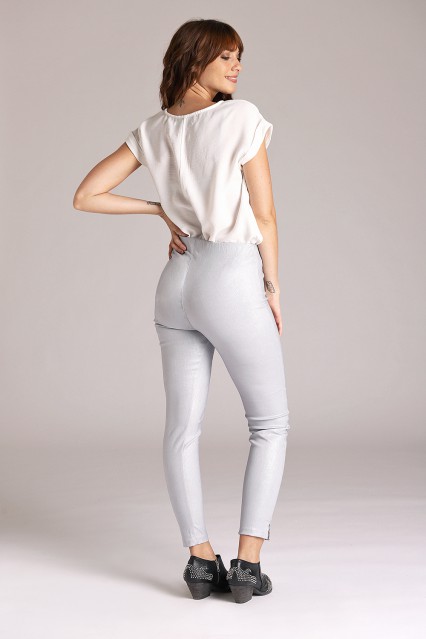 MÁS INFORMACION Realizado en Bengalina con foile que aporta un delicado brillo a la prenda. Cintura alta con elástico embutido. Estilo chupín con tajos laterales. Prenda básica de alta tendencia dada su materialidad.