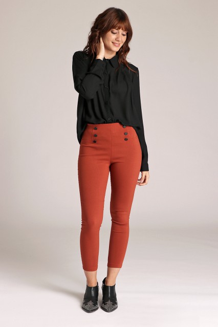 MÁS INFORMACION Realizado en Bengalina , materialidad que aporta excelente calce. Tiro alto con cintura ancha y elástico en interior. Botones de pie planos en baño negro opaco a modo decorativo le aportan un toque distintivo a un básico que te permitirá crear infinidad de looks.