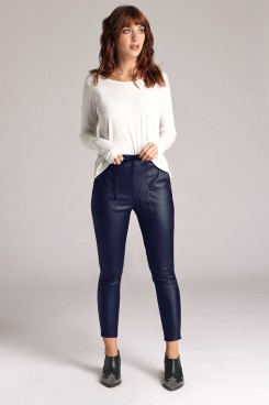MÁS INFORMACION Realizado en Bengalina engomada que aporta un brillo sutil a la prenda. Tiro medio. Con elástico embutido. Bolsillos plaqué en delantero. Cinta decorativa de ajuste de terciopelo al tono en cintura.