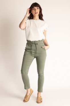 MÁS INFORMACION Realizado en Bengalina . Tiro alto. Cintura con elástico embutido y cinta de ajuste decorativas. Terminación de cintura con volados. Estilo chupín con tajos laterales. Bolsillos laterales. Prenda con la estética de un pantalón y el confort de una calza.
