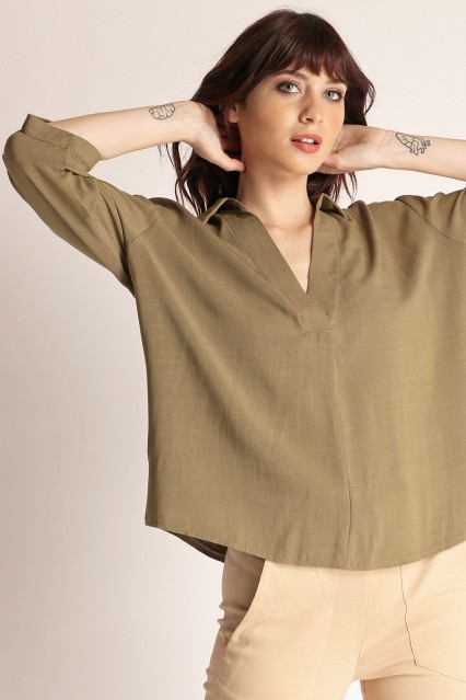 MÁS INFORMACION Realizado en Lino . Formato amplio. Cuello de camisa con abertura en V. Ruedo irregular curvo, más largo en espalda. Manga 3/4 con puño fijo. Hermosa paleta de color para crear infinidad de atuendos.